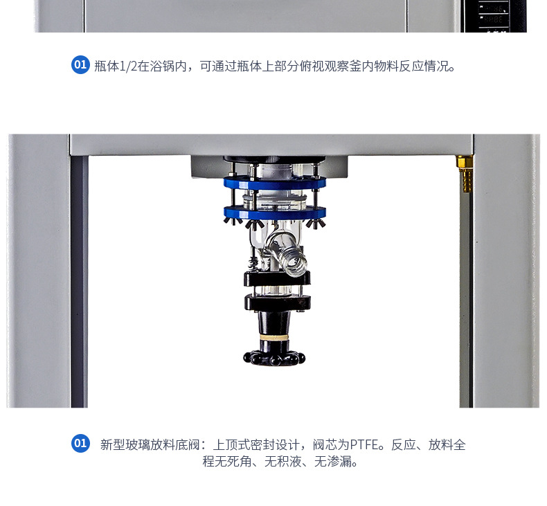5,阀芯为聚四氟乙烯,配有玻璃卸料底阀,在整个反应和卸料过程中无死角,无积液,无泄漏。